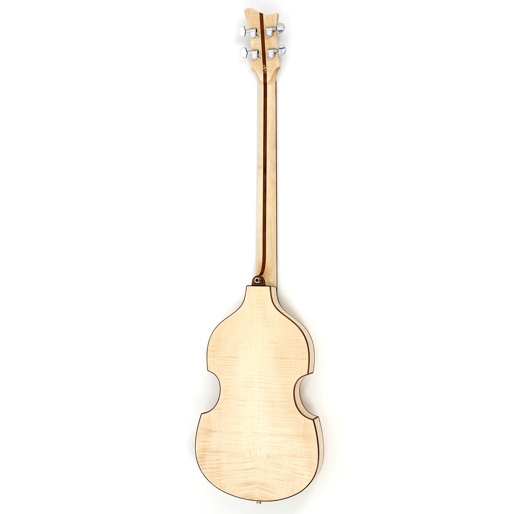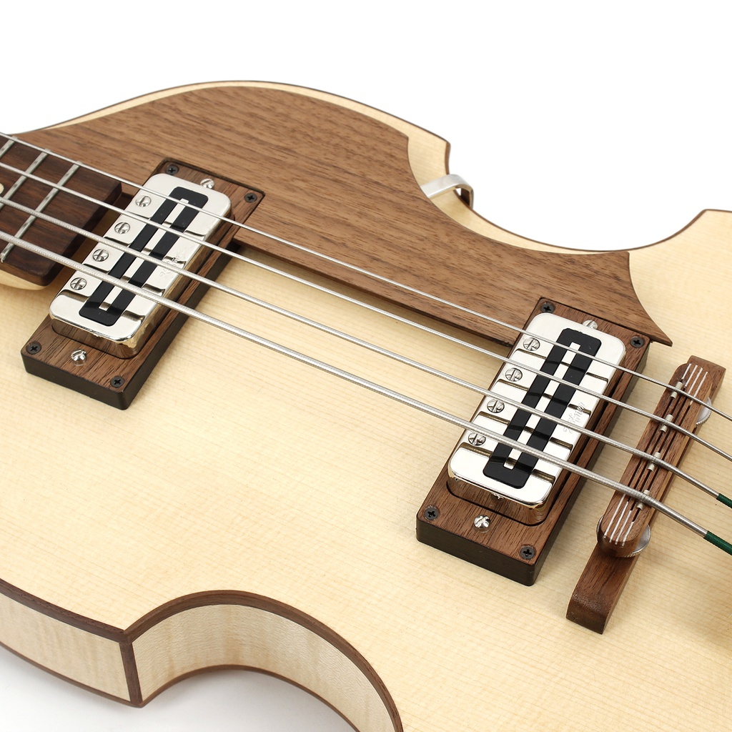 One of our aims with this instrument has been to eliminate as much plastic as possible and to use an environmentally friendly finish whilst retaining the looks and sound of the iconic Violin Bass. To this end the plastics used in the headplate, truss rod cover, heel plate, nut, pickup surrounds, scratchplate, dot markers and body binding have all been replaced with non-endangered walnut wood. The tuners and buttons are now metal which can easily be recycled. We replaced the ebony bridge with one crafted from walnut. The bass is finished in a light wax coat which is not poisonous to the environment and also very easy to repair should that be needed in the future.