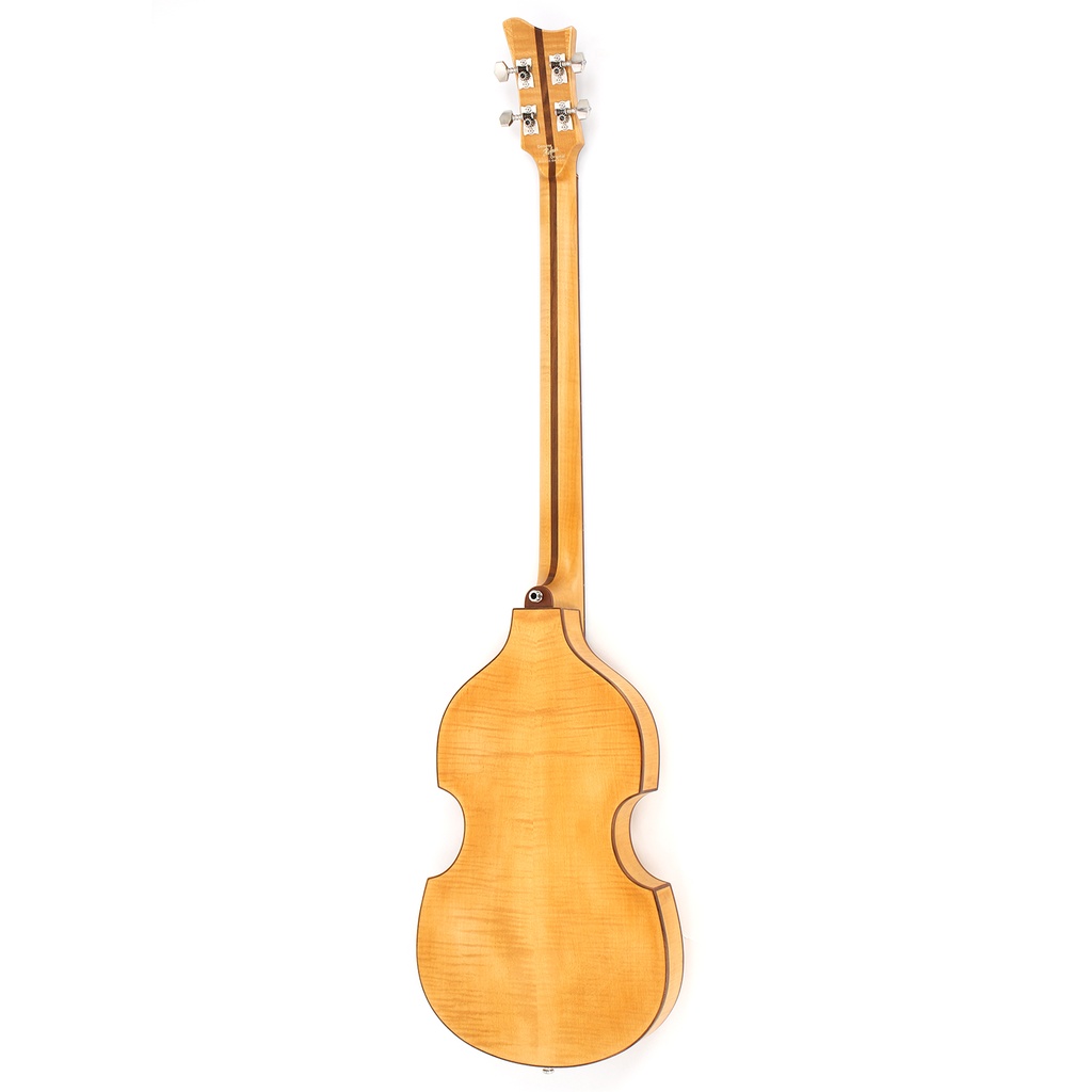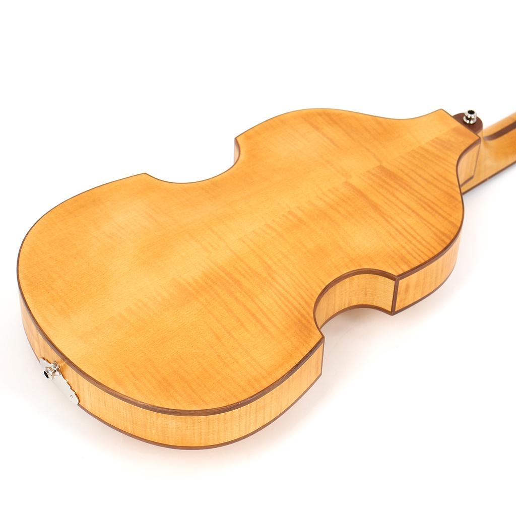 One of our aims with this instrument has been to eliminate as much plastic as possible and to use an environmentally friendly finish whilst retaining the looks and sound of the iconic Violin Bass. To this end the plastics used in the headplate, truss rod cover, heel plate, nut, pickup surrounds, scratchplate, dot markers and body binding have all been replaced with non-endangered walnut wood. The tuners and buttons are now metal which can easily be recycled. We replaced the ebony bridge with one crafted from walnut. The bass is finished in a light wax coat which is not poisonous to the environment and also very easy to repair should that be needed in the future.