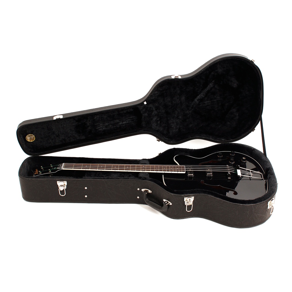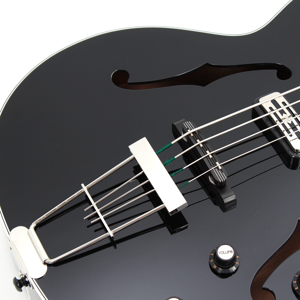 Short scale maple neck with rosewood fingerboard, dot inlays and vintage style tuners add to the 50s vibe. Two Höfner ‘Toaster’ pickups with volume and tone controls. Raven black finish. Includes case.