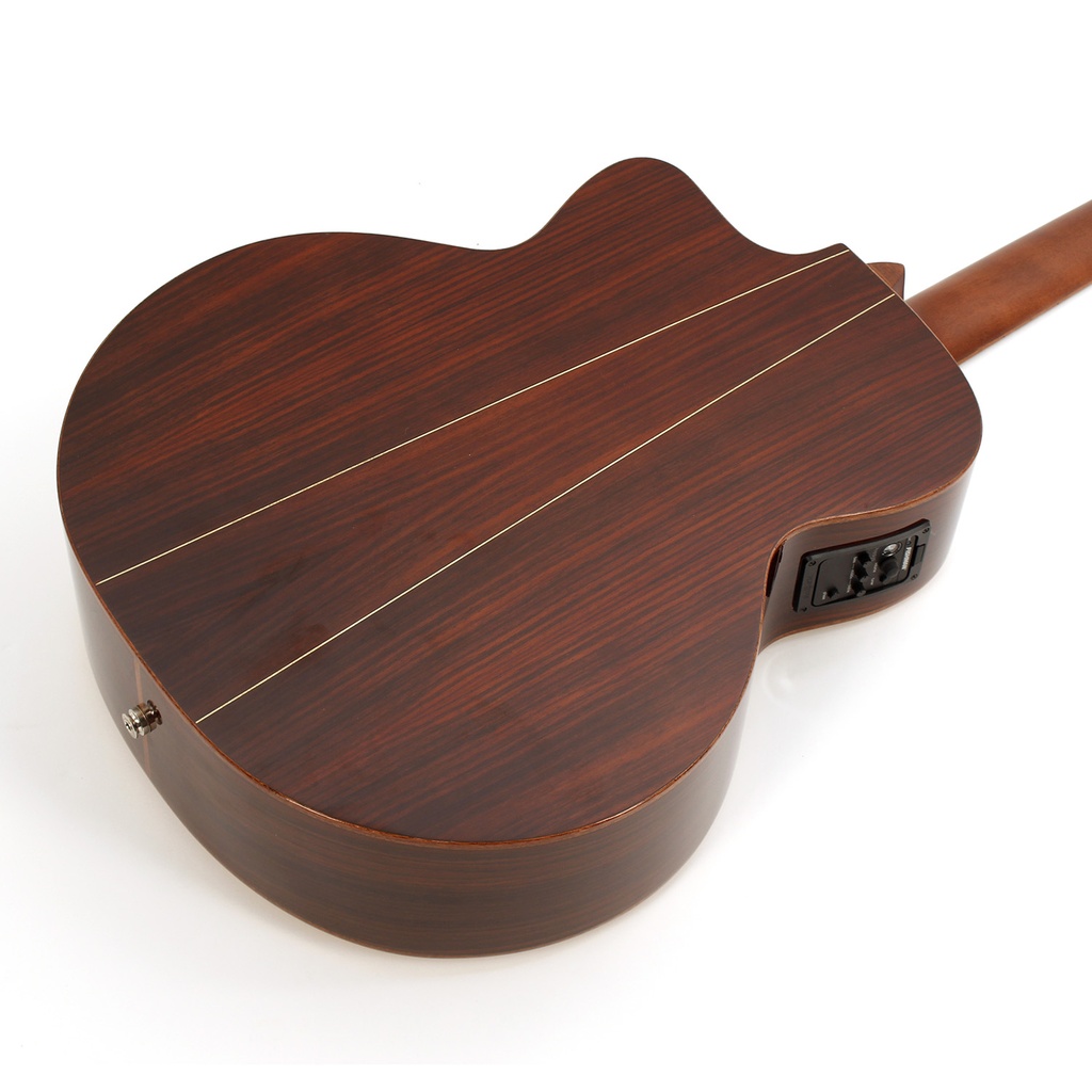 Highly figured rosewood body with high grade solid spruce top. Rosewood body. Chrome hardware.