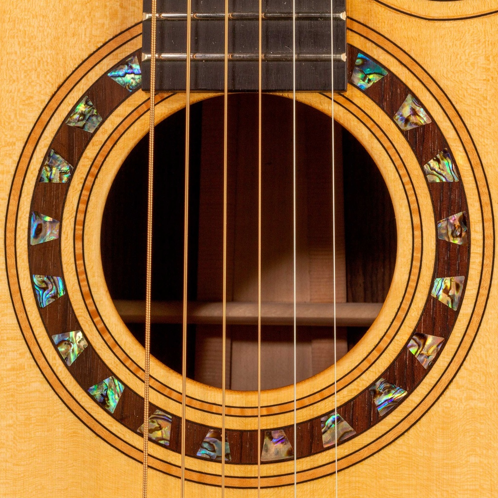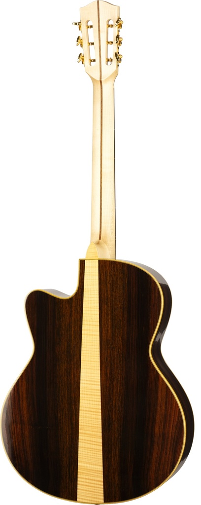 For this masterbuilt steel string series, we developed a completely new body shape, with the focus on our European guitar making heritage. The design is original, modern and tasteful, the craftsmanship flawless. For the eye and the ear we have chosen a combination of handselected tonewoods that is as noble as it is sonorous: The top is made of finest alpine spruce, the body of East Indian rosewood, the back is a 3 piece with a centre stripe of well flamed maple. The neck is made of maple and for the fretboard we have selected fine and very old ebony.