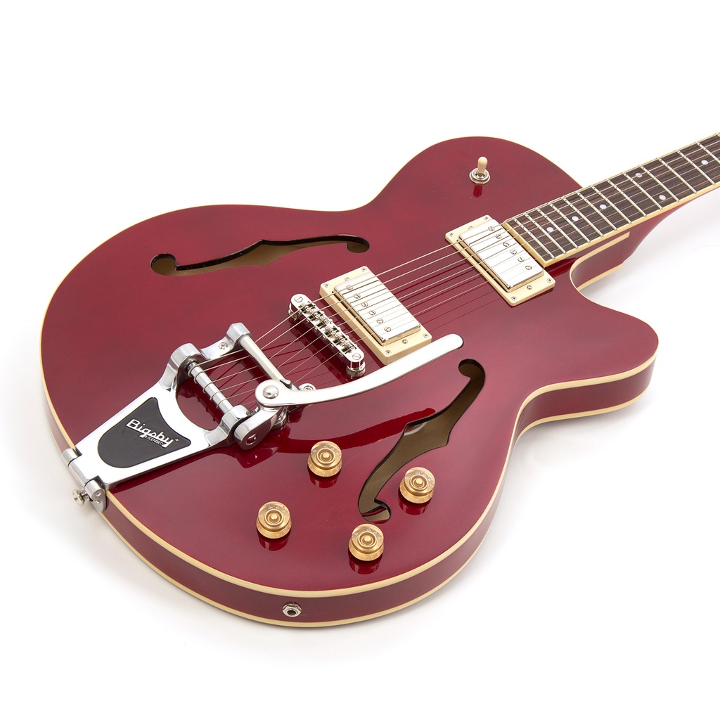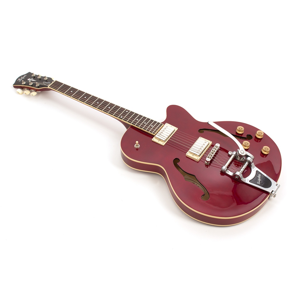 The Contemporary model is fitted with full size Höfner humbuckers that deliver full on tone letting you use this guitar for a wide variety of styles from blues through to full on heavy rock. With a solid spruce centre sustain block you achieve even more sustain, better volume and less feedback. The genuine Bigsby vibrato is used in combination with a roller bridge for perfect tuning and playing. With a spruce top, maple back and sides this is the perfect alternative semi-acoustic guitar.