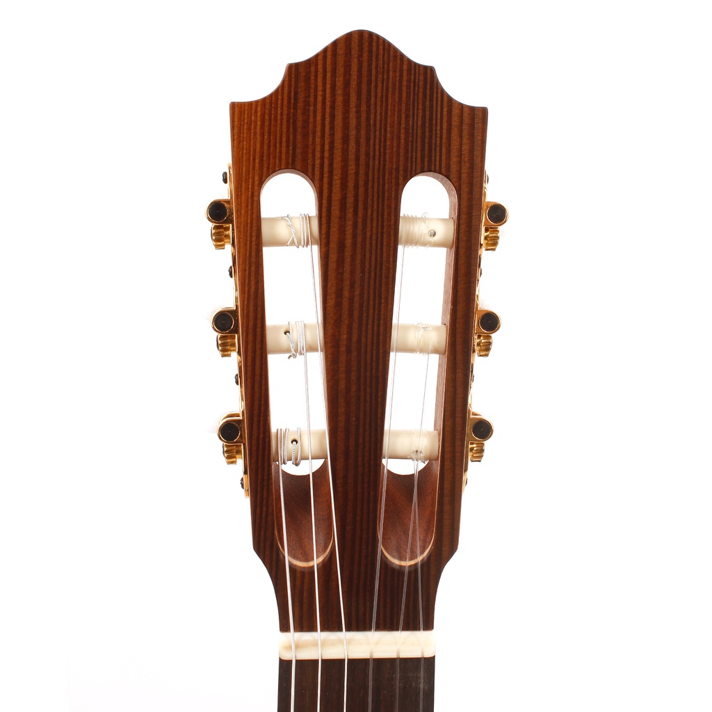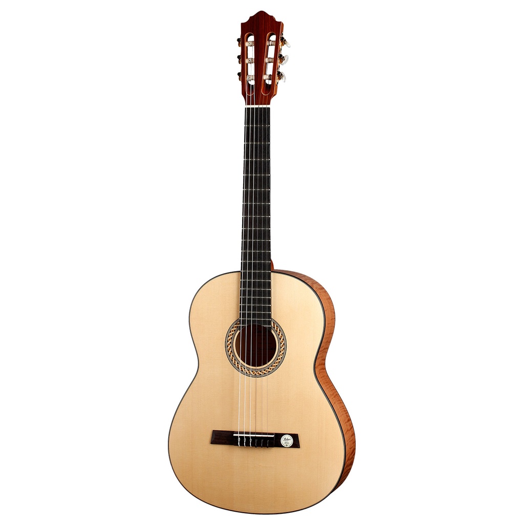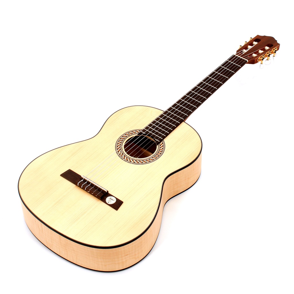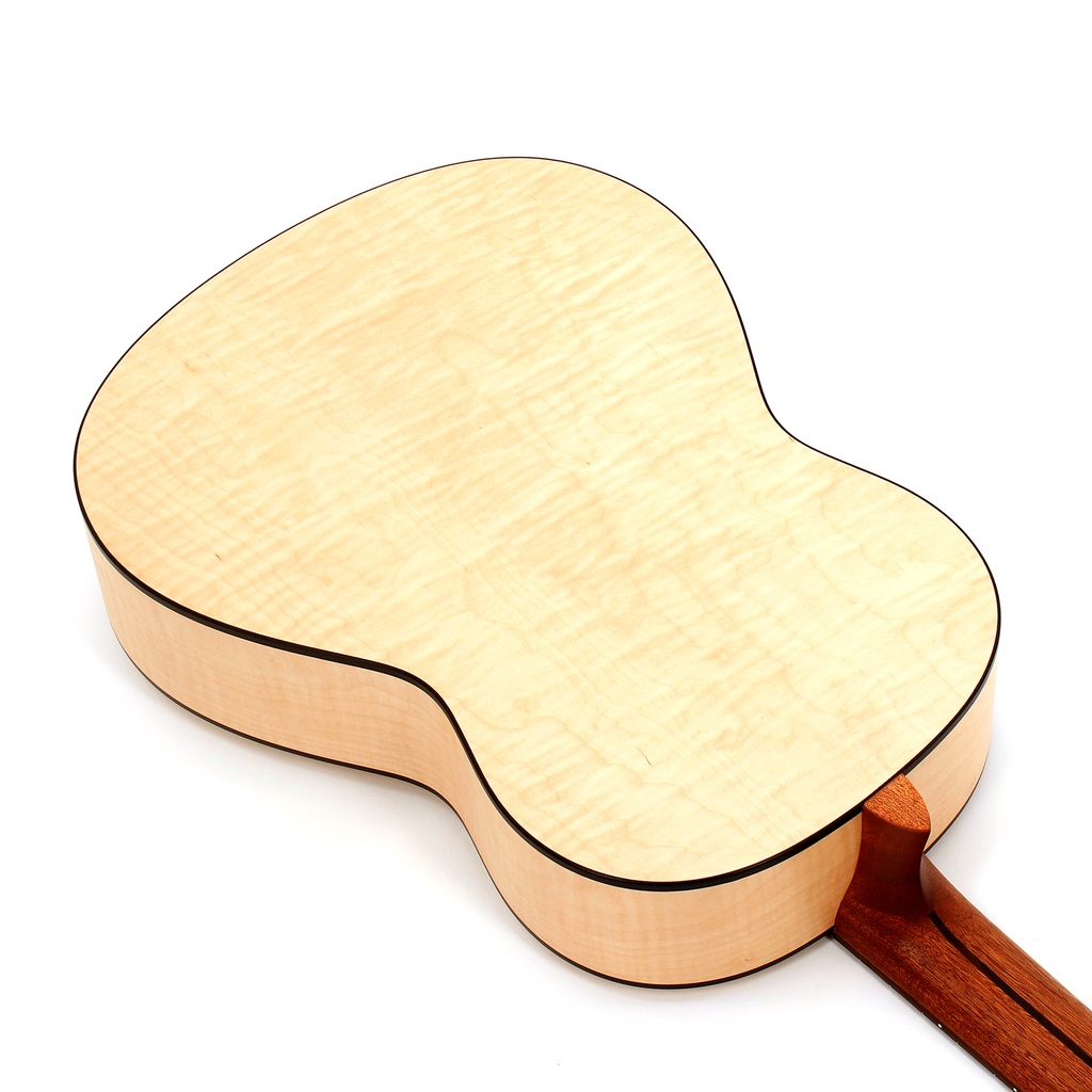 From its distinctive ribboned rosette around the soundhole to its light blonde solid spruce top, the pleasing appearance of the handmade HLE-AF is matched by its superior tone. Finished in matt, the back and sides are created from flamed hard maple. The mahogany neck with rosewood fingerboard ensures a level of playability one would expect from an instrument of this quality. The bridge saddle is made of bone to guarantee perfect string energy transmission, and the instrument has a 65cm scale with a 50mm nut width.