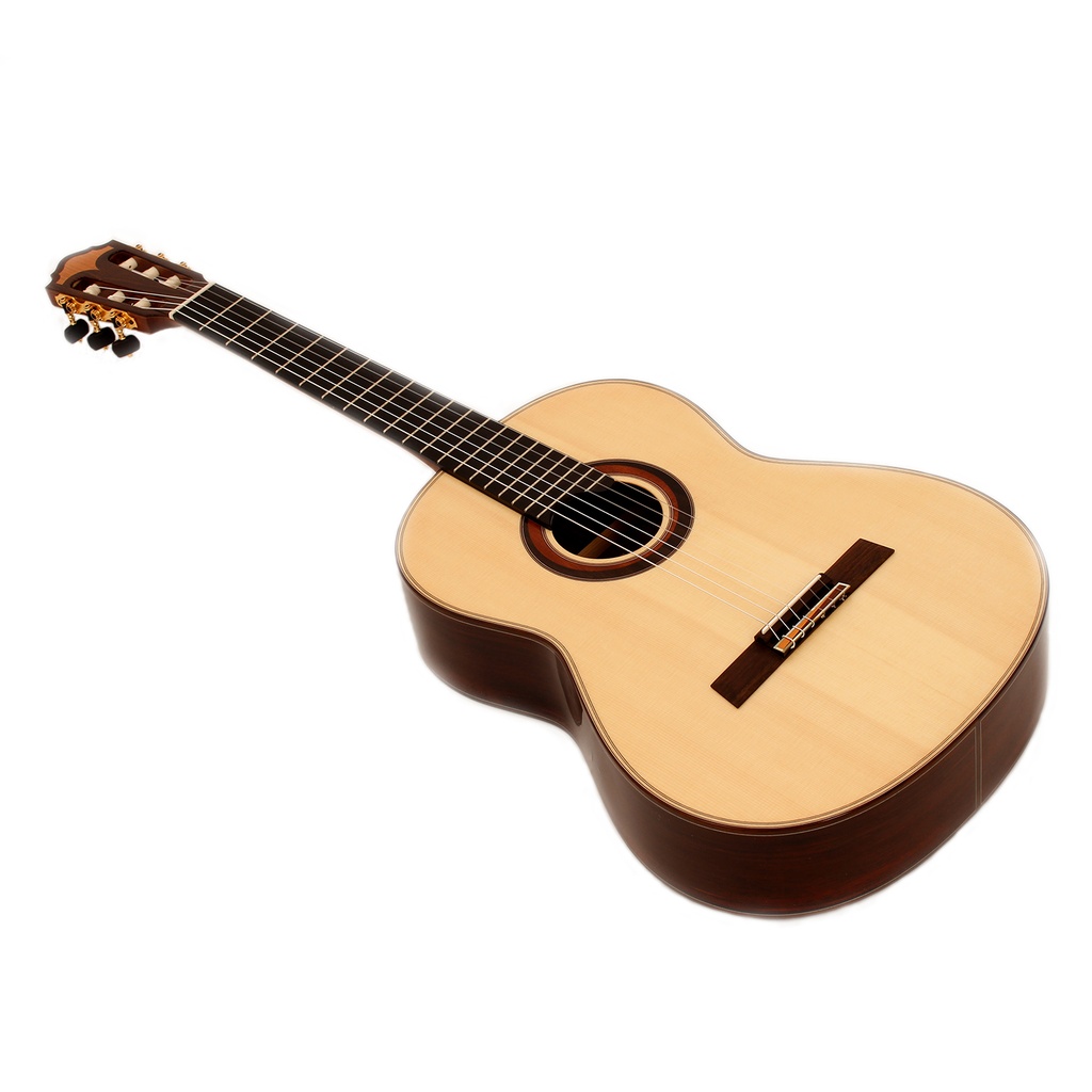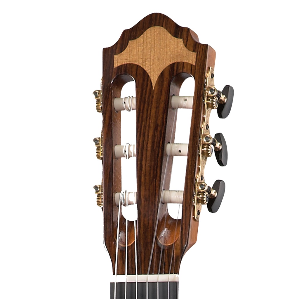 This classical guitar is produced using select tonewoods air seasoned over many years in our own wood stores. The back and sides are from selected Cocobolo and feature a high gloss violin varnish whilst the AAA spruce top is given a wafer thin polish. It has an ebony keyboard, an oil-finished neck and a stepped head plate.